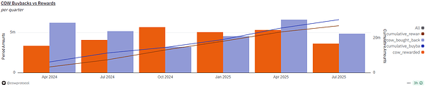Despite being core to the success of the protocol, distributing solver rewards has historically generated an inflationary impact on the circulating supply of COW tokens. This ceased being the case in April of last year when CoW DAO began using a portion of CoW Protocol revenue to buy back COW tokens on the open market – thereby counteracting the impact of solver rewards on token supply.