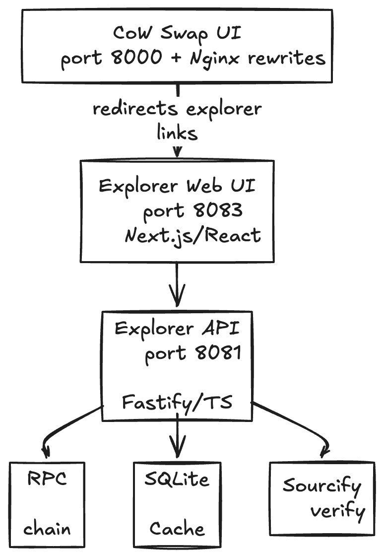 /blocks,/tx/:hash) - In the Playground / CoW UI, click any transaction / block link — it should open in the local explorer (via nginx rewrites configured in